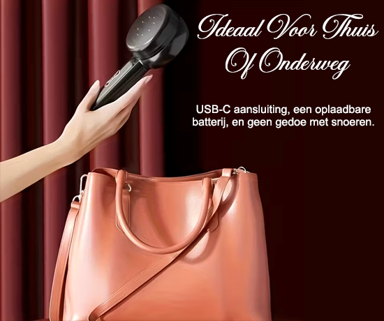 voor thuis gebruik of onderweg. Uitgerust met een USB-C aansluiting, een oplaadbare batterij met een lange gebruiksduur, geen gedoe met snoeren of ingewikkelde bediening. Een ergonomisch ontwerp voor comfortabel gebruik, zelfs bij langere sessies.
